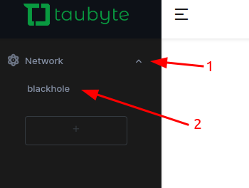 Next steps involve the web console’s sidebar: (1) select Network, followed by (2) blackhole.
