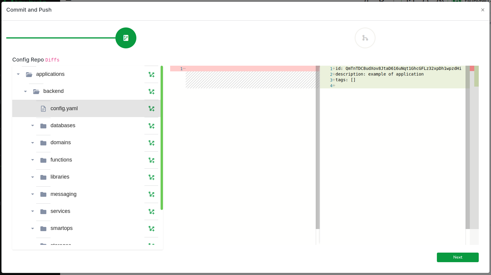 Changes are currently only saved locally in your browser's virtual filesystem. Click on the green button on the bottom right corner. Applicatuion configuration and file system structure has been created in the config repo.