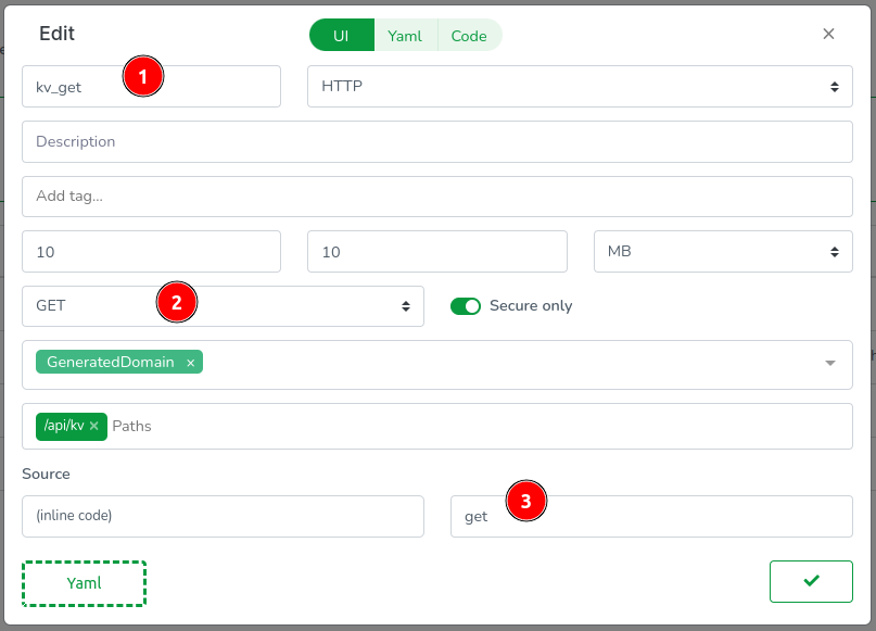 Edit the freshly cloned function, name it kv_get, set the method to GET, and set the entry point to get.