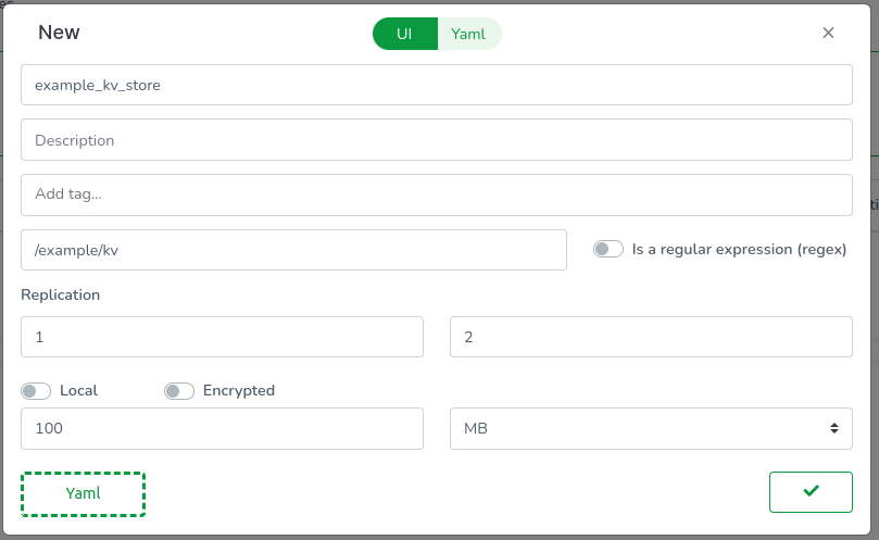 Name the database example_kv_store. As a matcher, use /example/kv. Set replication to min=1, max=2. Set the size to 100MB and validate.