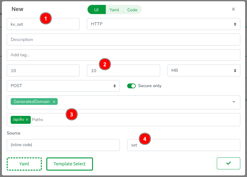 Start with the upload function. Go to Functions and click on the + button. Create a new function named kv_set. Ensure it has enough memory; 10MB should be more than enough. Set the method to POST, use the generated domain, set the path to /api/kv, and set the entry point to set.