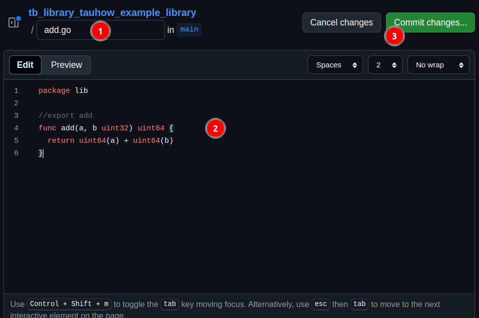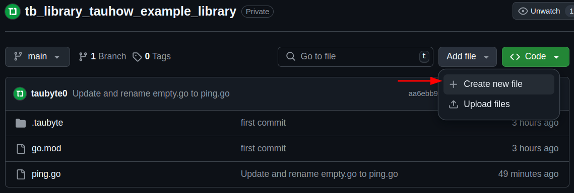 Let's add an other function to our library (which will compile to a wasm module). Open the library repository in another tab. The click on Add file > Create new file.