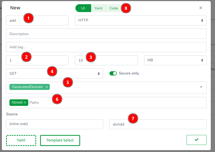 Name the function add, set the timout to 1 second, the memory limnit to 10MB, the method to GET, the domain to GeneratedDomain , the path to /lib/add and the entry point to doAdd.
