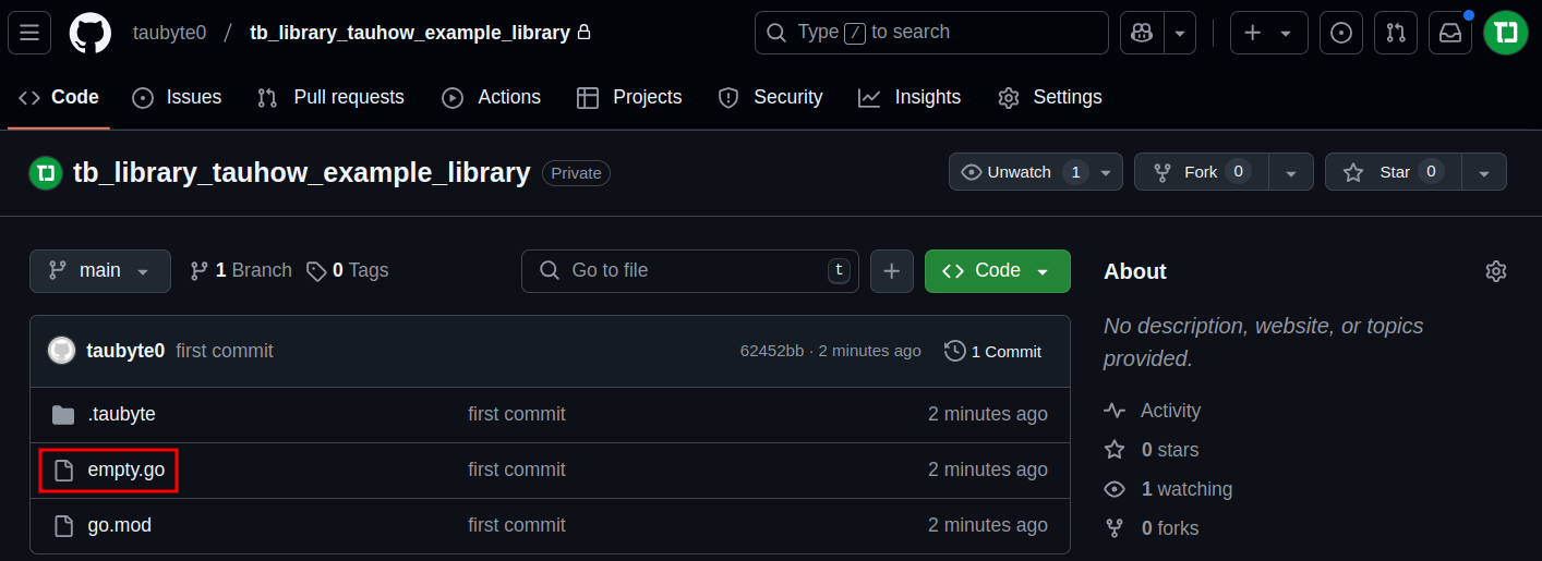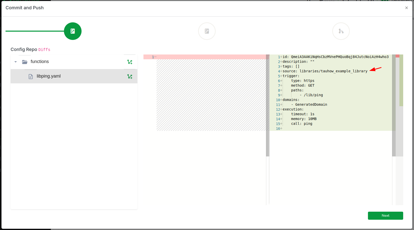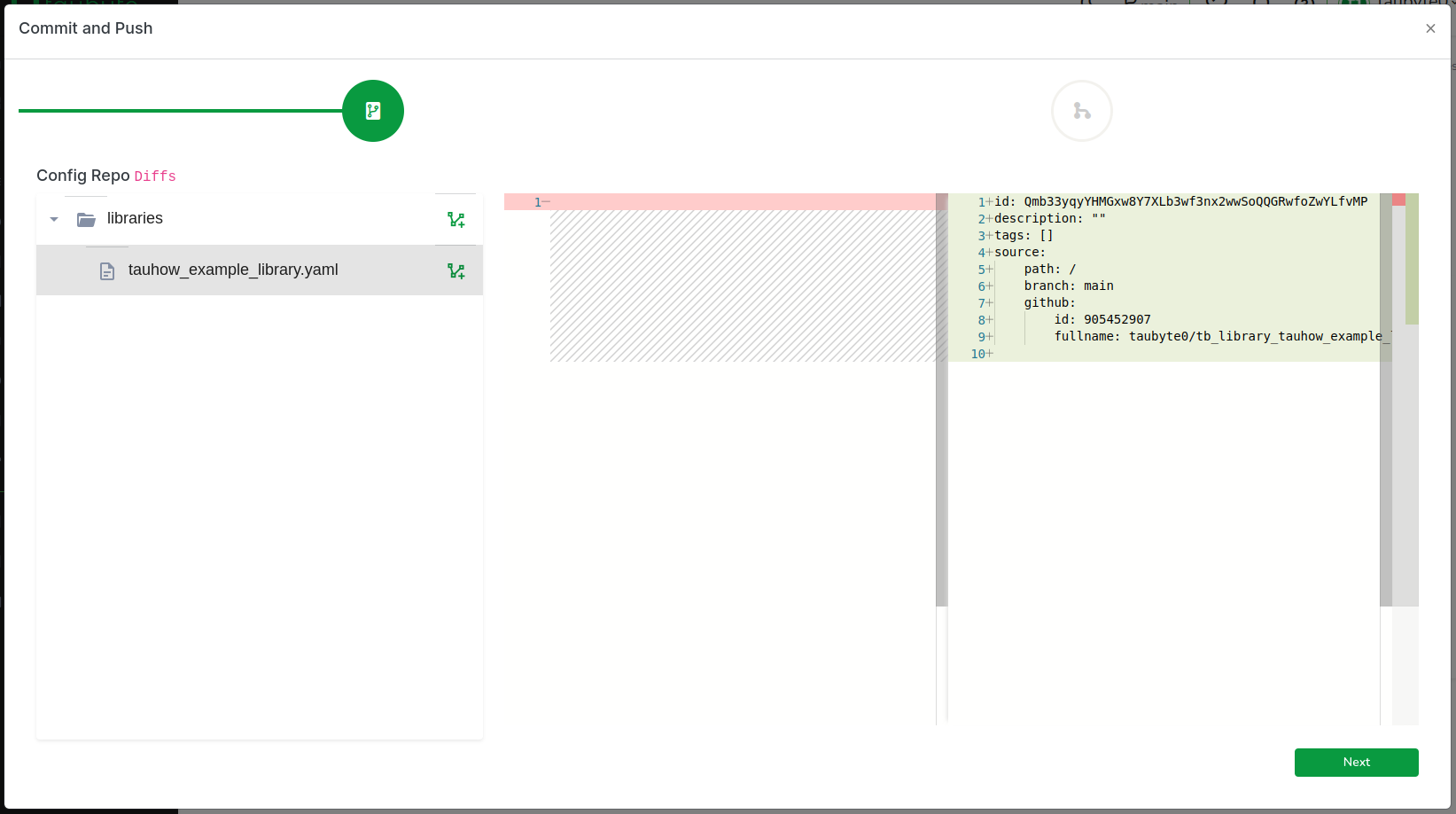 Push the configuration changes. Click on the push button on the bottom right. Save the github repository id (in the example 905452907) and its fullname (in the example taubyte0/tb_library_tauhow_example_library), we'll use them later.