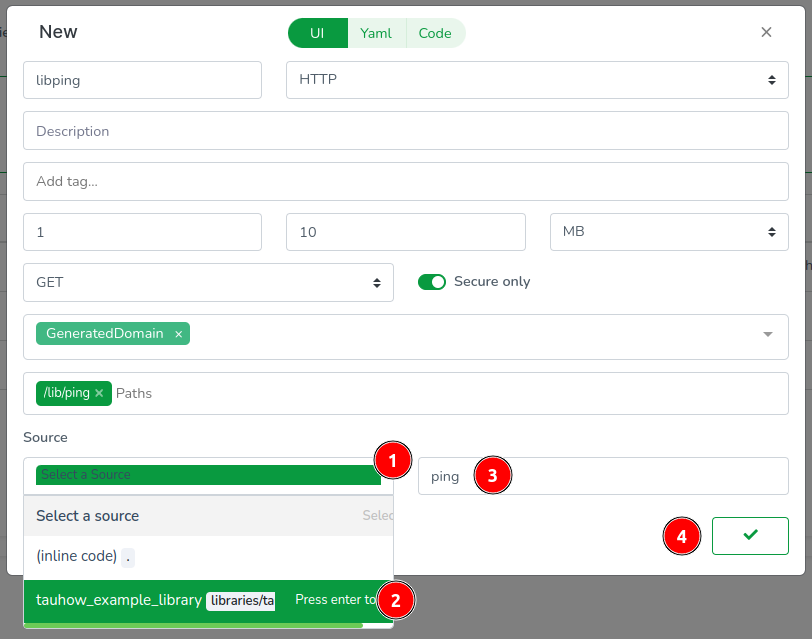 Navigate to the Functions tab on the left sidebar. Then click on + to create a new function. Name it, set the timout to 1 second, the memory limnit to 10MB, the method to GET, the domain to GeneratedDomain and the path to /lib/ping.